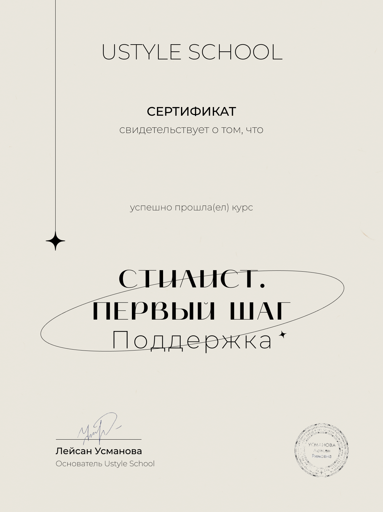 Я прошла курс “Стилист. Начало”, и хочу поблагодарить Лейсан Усманову и всю команду за то, сколько сил они вложили в этот курс, в меня лично и в каждого участника. Лейсан замечает суть вещей и людей. Если вы вдруг в чем-то сомневаетесь, не знаете, куда дальше идти — идите на этот курс. Я выявила в себе столько страхов! И я не просто их увидела — мне помогли с ними справиться. Спасибо огромное за то, какую невероятную работу вы делаете!